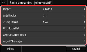 Du kan ändra standardinställningarna för funktionen Minnesenhetsutskrift som hämtas från kontrollpanelen.