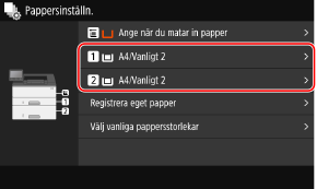 Standardinställningen för pappersformat och papperstyp är A4 och Vanligt 2. Ändra pappersinställning om du använder annat format eller annan typ.