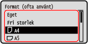Välj det pappersformat som har fyllts på i papperslådan och tryck på