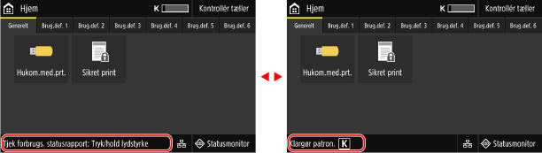 ] på kontrolpanelet. Som standard vises skærmen [Hjem], efter at strømmen er blevet tændt og umiddelbart efter, at startskærmen lukkes, og umiddelbart efter, at du har logget dig ind. Skærmen [Hjem]
