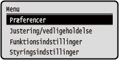 Ændring af skærmvisningenDu kan ændre visningen på kontrolpanelet ved f.eks. at ændre visningssproget og enheder og vise eller skjule meddelelser. [Visningsindstillinger] Du kan invertere skærmens farver og justere lysstyrken for at gøre skærmen nemmere at se. [Tilgængelighed] Automatisk rydning af indstillingerneSom standard, hvis der ikke udføres nogen handlinger efter en vis periode, bliver indstillingerne, der bliver konfigureret på skærmen, ryddet, og skærmen [Hjem] vises. Du kan ændre tidspunktet for, hvornår indstillingerne ryddes og skærmen, der vises bagefter. [Tid før automatisk nulstilling] [Funktion eft. autonulstilling] |