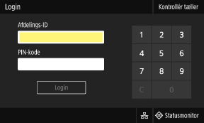 Hvis administrering af afdelings-id er indstillet, vises følgende login-skærm. Indtast afdelings-id'et for at logge på. Hvis der er indstillet en PIN-kode, skal du indtaste PIN-koden.