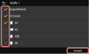 Ryd afkrydsningsfelterne for de papirstørrelser, du ønsker at skjule, og klik på [Anvend].