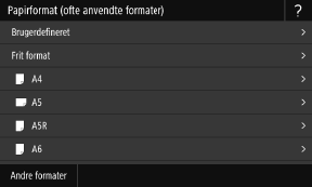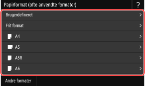 Tryk på [Andre formater], og vælg papirstørrelsen fra den viste liste.
