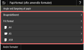 Tryk på [Andre formater], og vælg papirstørrelsen fra den viste liste.