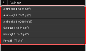 Du kan rulle ned på skærmen for at få vist papirstørrelser (som f.eks. konvolutter), der ikke vises på skærmen.