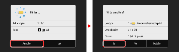I dette tilfælde skal du annullere udskrivningen ved hjælp af maskinens kontrolpanel eller Fjern-UI.
