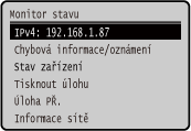 na ovládacím panelu. Pomocí této obrazovky můžete zkontrolovat informace o zařízení, využití a protokoly, síťová nastavení a informace o chybách. Obrazovka [Monitor stavu]|