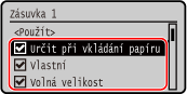 Velikosti papíru, jejichž políčka nejsou zaškrtnutá, se na obrazovce nastavení papíru nezobrazí.