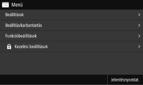 A beállítások automatikus törléseHa egy bizonyos ideig semmilyen műveletet nem végez, az éppen konfigurálás alatt lévő beállítások törlődnek a képernyőről, és megjelenik a [Főképernyő] képernyő. A beállítások törléséig eltelt idő és az ezután megjelenő képernyő egyaránt módosítható.