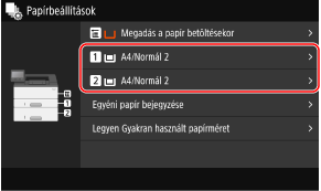Alapértelmezett beállításként a papírméret az A4, a papírtípus pedig a Normál 2 értékre van állítva. Ha ettől eltérő méretű vagy típusú papírt használ, módosítsa a papírbeállításokat.