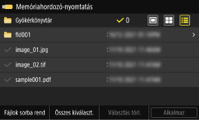 Az összes megjelenített fájl kiválasztásához válassza ki az [Összes kiválaszt.] lehetőséget a képernyő alsó részén. Ha az adathordozó PDF- és képfájlokat (JPEG- vagy TIFF-fájlokat) is tartalmaz, akkor megjelenik a fájltípus kiválasztására szolgáló képernyő. Válassza ki a képernyőn a nyomtatni kívánt fájl típusát.