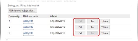 A prioritás beállításához kattintson a házirend nevétől jobbra található [Fel] vagy [Le] elemre. A magasabb prioritású házirendek elsőbbséget élveznek az IPSec-kommunikációra való alkalmazáskor.