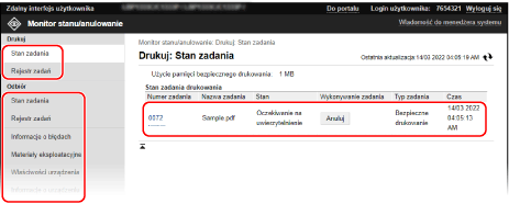 Na stronie portalu zdalnego interfejsu użytkownika kliknij na [Monitor stanu/anulowanie].