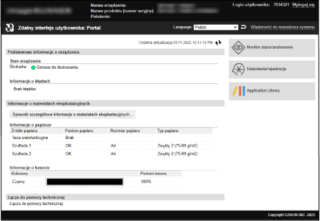 Kiedy zalogujesz się do zdalnego interfejsu użytkownika, pojawi się strona portalu (górna strona zdalnego interfejsu użytkownika). Z tego miejsca możesz sprawdzić stan działania urządzenia, przejrzeć różne informacje i zmienić ustawienia za pomocą klawiszy.