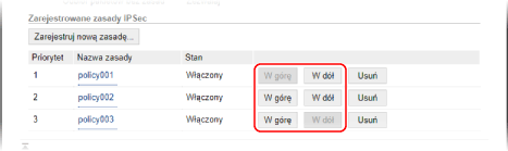 Kliknij [W górę] lub [W dół] po prawej stronie nazwy zasady, aby ustawić priorytet. Zasada wyższego poziomu ma pierwszeństwo w zastosowaniu do komunikacji IPSec.