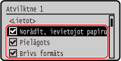 Papīra iestatījumu ekrānā parādīti reģistrētie bieži lietotie papīra formāti. Ja tiek parādīti nelietoti papīra formāti, varat tos katram papīra avotam paslēpt, lai atvieglotu papīra formāta izvēli.