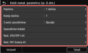 Taip pat galite atstatyti parametrus į čia nustatytus parametrus spausdinimo parametrų ekrane paspausdami [Atkurti].