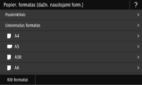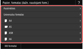 1 veiksmo ekrane galite pakeisti rodomą popieriaus formatą. Nenaudojamų popieriaus formatų paslėpimas