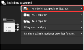 Jei daugiafunkciam dėklui visada naudojate tokį patį popierių, popieriaus formatą ir tipą galite užregistruoti. Taip nebus rodomas popieriaus parametrų ekranas, kurių jums nereikės konfigūruoti.
