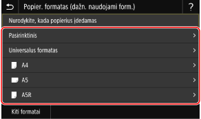 Kai į universalųjį dėklą įdedamas popierius, valdymo skydelyje rodomas popieriaus formato ir tipo nustatymo ekranas.