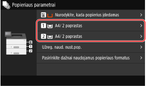 Pagal numatytuosius nustatymus popieriaus stalčiaus popieriaus dydis ir tipas yra nustatytas į A4 ir 2 paprastas. Jei įdėtas kitokio formato ar tipo popierius, pakeiskite popieriaus parametrus.