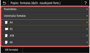 Galite slinkti ekranu, kad peržiūrėtumėte popieriaus formatus, kurie nerodomi ekrane.