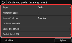 [Canviar opcions predeterminades (Impressió dispositiu memòria)]