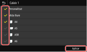 La pantalla de configuració de paper mostra les mides de paper registrades que utilitzeu freqüentment. Si hi apareixen mides de paper que no utilitzeu, les podeu amagar per a cada origen de paper per facilitar la selecció d'una mida de paper.