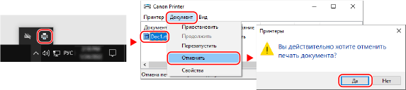 Если значок принтера в области уведомлений Windows не отображается или если не отображается документ, печать которого следует отменить, данные печати после обработки на компьютере отправляются в аппарат.