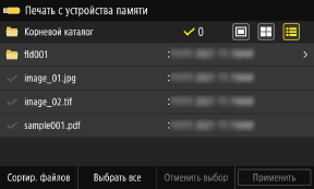 Установите запоминающее устройство USB в аппарат, затем нажмите на экране [Главный] кнопку [Печать с устр-ва памяти] для отображения файлов и папок в запоминающем устройстве USB.