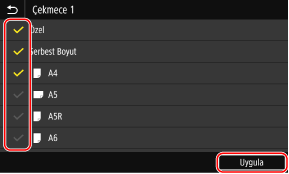 Onay kutularının işareti kaldırılmış olan kağıt boyutları, kağıt ayarları ekranında görüntülenmez.