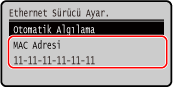 Makine kablolu LAN'a bağlıyken, makineye ayarlanan MAC adresini görüntüleyebilirsiniz.