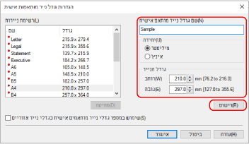 הזן את שם הנייר בגודל המותאם אישית ואת גודל הנייר, ולחץ על [Register].