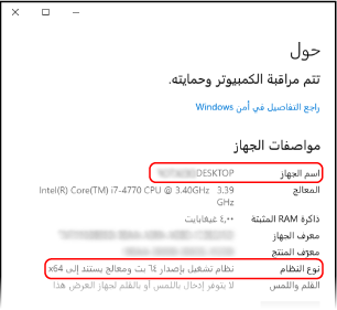 إذا كان نظام التشغيل بالكمبيوتر 64-بت، فسيُعرض "نظام التشغيل ٦٤ -بت".