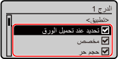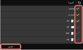 لا تُعرض أحجام الورق التي تم مسح مربعات الاختيار الخاصة بها على شاشة إعدادات الورق.