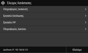 Χρησιμοποιήστε αυτήν την οθόνη για να ελέγξετε τις πληροφορίες της συσκευής, τη χρήση και τα αρχεία καταγραφής, τις ρυθμίσεις δικτύου και τις πληροφορίες σφάλματος. Μπορείτε επίσης να χρησιμοποιήσετε αυτήν την οθόνη για να αφαιρέσετε συσκευές μνήμης USB από τη συσκευή.