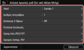 Μπορείτε να αλλάξετε τις προεπιλεγμένες ρυθμίσεις για τη λειτουργία εκτύπωσης από μέσα μνήμης που καλείται από τον πίνακα ελέγχου.