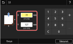 Μπορείτε να καταχωρίσετε τα μεγέθη, όταν χρησιμοποιείτε συχνά συγκεκριμένο χαρτί μη τυπικού μεγέθους. Μπορείτε να καλέσετε το χαρτί στην οθόνη εισαγωγής μεγέθους, αποφεύγοντας έτσι τη φασαρία να εισαγάγετε το μέγεθος.