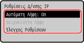 Κανονικά, ορίζεται το [DHCP]. Ωστόσο, όταν το [DHCP] οριστεί σε περιβάλλον στο οποίο δεν μπορεί να χρησιμοποιηθεί, η συσκευή θα συνεχίσει να επιβεβαιώνει την Αυτόματη Λήψη στο δίκτυο, δημιουργώντας περιττή επικοινωνία. Όταν δεν χρησιμοποιείτε DHCP, ορίστε το σε [Off].