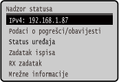 na upravljačkoj ploči. Upotrijebite ovaj zaslon da biste pogledali informacije o uređaju i korištenju te zapisnike, mrežne postavke i informacije o pogreškama. Zaslon [Nadzor statusa]|