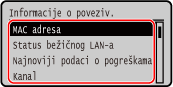 Kada je uređaj spojen na bežični LAN, uz MAC adresu i podatke o vezi za bežični LAN možete pregledati i sigurnosne postavke.
