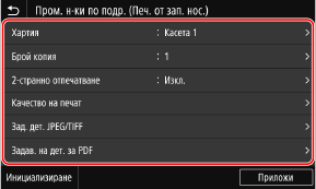 Можете също така да подновите настройките до настройките, зададени тук, като натиснете [Нулиране] на екрана за настройка за печатане.
