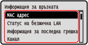 В допълнение към MAC адреса и информацията за свързване на безжичната LAN, когато устройството е свързано към безжичната LAN мрежа, можете също така да видите и настройките за защита.
