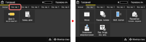 Торкніться екрана та перегорніть його кінчиком пальця. Екран рухається в напрямку гортання. Наприклад, екран [Головний] перегортається на відповідну вкладку в напрямку гортання пальцем.