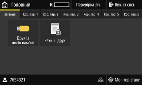 [Вих. із сист.]Відображається, коли користувач ввійшов у систему. Натисніть, щоб вийти із системи після завершення операцій на апараті.