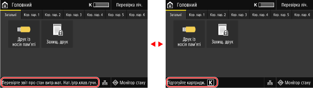 на панелі керування. Цей екран дає змогу перевірити інформацію про апарат, його використання та журнали, параметри мережі й відомості про помилки. Екран [Монітор стану]Модель сенсорної панелі | Модель чорно-білого РК-дисплея | |