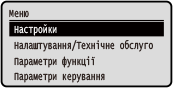 Змінення інтерфейсу екранаВи можете змінити інтерфейс панелі керування, наприклад, змінити мову інтерфейсу й одиниці вимірювання, та показати чи приховати повідомлення. [Параметри відображення] Можна інвертувати кольори екрана й налаштувати яскравість, щоб полегшити перегляд вмісту екрана. [Спеціальні можливості] Автоматичне очищення параметрівЗа замовчуванням, якщо після певного періоду часу не виконуються жодні операції, буде очищено параметри, які налаштовуються на екрані, і відобразиться екран [Головний]. Можна змінити час, що минає до очищення параметрів, і екран, який відображається після цього. [Час автоматичного скидання] [Функція після авт. скидання] |