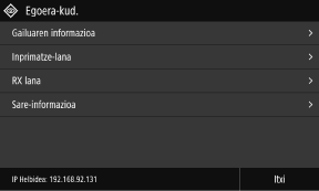 Erabili pantaila hau makinaren informazioa, erabilera eta egunkariak, sare-ezarpenak eta erroreen informazioa begiratzeko. Pantaila hori USB memoria-gailuak makinatik kentzeko ere erabil dezakezu.