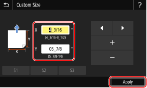 2 | Enter the values in [X] and [Y], and press [Apply]. Select [X] or [Y], and enter the length of each side using [+] and [-], with  /  to move the cursor between the digits for inputting whole numbers and fractions. When frequently used non-standard sizes are registered, you can call these up by pressing [S1] to [S3]. |